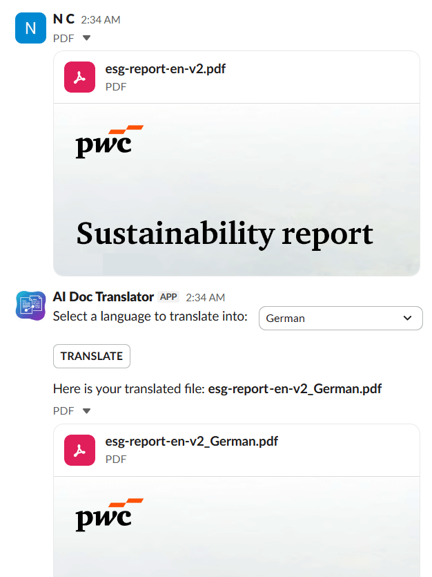 Just drag and drop your file into a channel with the assistant or send it in a direct message. AI Doc Translator will ask you to choose a language, and then it will start translating. You'll get the translated file back in the same chat when it's ready.